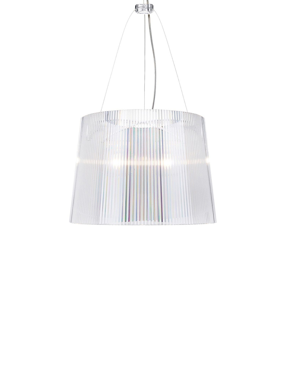 Ge — подвесной светильник, крепящийся к потолку с помощью декоративной розетки, напоминающей старинные венецианские люстры. Он оснащен плиссированным абажуром диаметром 37 см. Высота троса регулируется от 45 до 230 см.