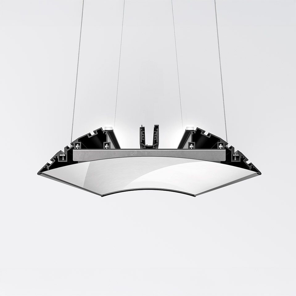Выпуклая балка объединяет множество функциональных элементов, обеспечивая разнообразное освещение, сохраняя при этом открытую структуру, допускающую дальнейшее развитие и индивидуальную настройку. Каждая сторона имеет три монтажных канала на разных уровнях, что позволяет устанавливать точечные светильники как на виду, так и в нишах основной конструкции, обеспечивая точное направленное освещение. Рассеянный свет мягко рассеивает свет по всему пространству. Два больших отсека расположены в верхней части конструкции, в них размещаются драйверы, проводка, датчики и другие компоненты, необходимые для конкретных установок.