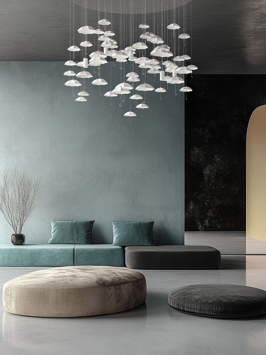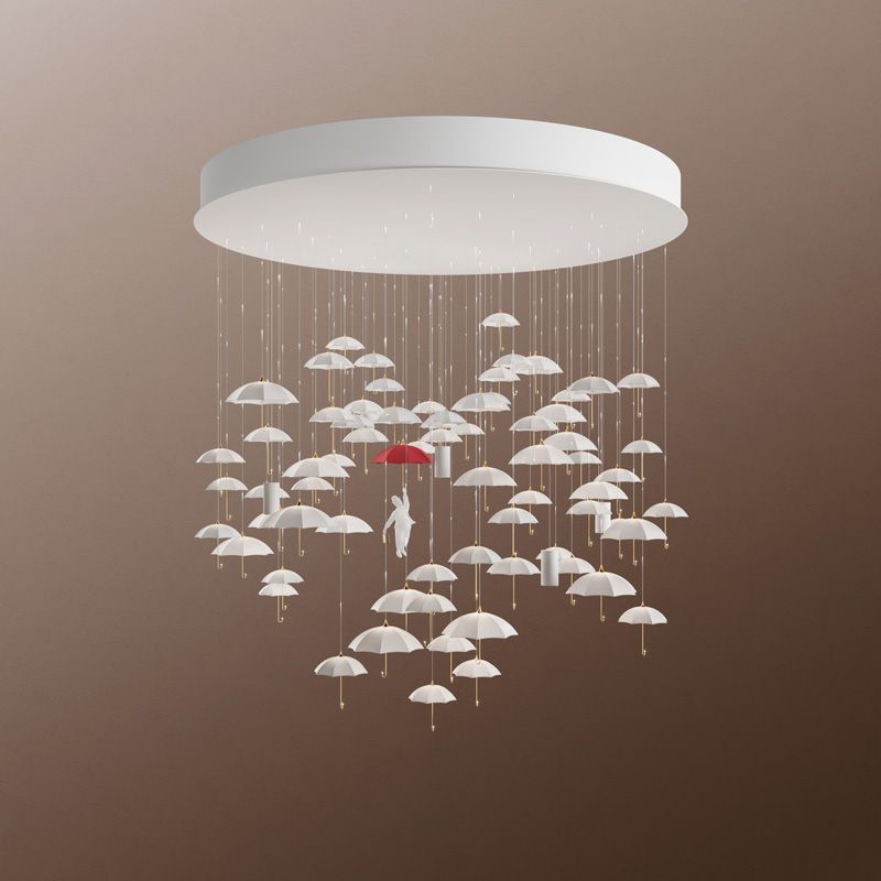 Люстра René – уникальный продукт совместного творчества итальянской школы дизайна и команды Sagarti, который создает новую реальность в дизайне интерьера. Коллекция "Rene" включает люстры и подвесные светильники, вдохновленные произведениями Рене Магритта. Центральный элемент — фарфоровый зонтик с оптоволокном, создающий эффект парящего света. Фигурка летящего человека добавляет сюжет и символизм, а разнообразие размеров позволяет использовать коллекцию в гостиных, холлах и лестничных пролетах.