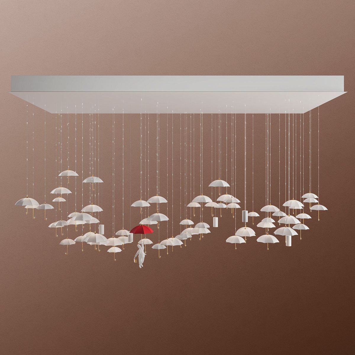 Люстра René – уникальный продукт совместного творчества итальянской школы дизайна и команды Sagarti, который создает новую реальность в дизайне интерьера. Коллекция "Rene" включает люстры и подвесные светильники, вдохновленные произведениями Рене Магритта. Центральный элемент — фарфоровый зонтик с оптоволокном, создающий эффект парящего света. Фигурка летящего человека добавляет сюжет и символизм, а разнообразие размеров позволяет использовать коллекцию в гостиных, холлах и лестничных пролетах.