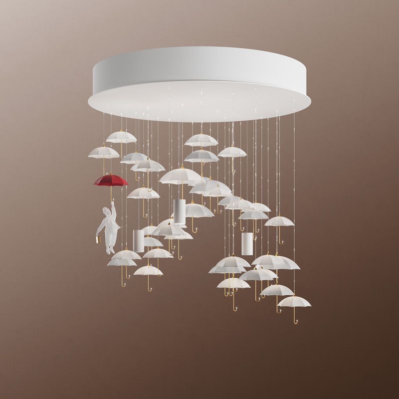 Люстра René – уникальный продукт совместного творчества итальянской школы дизайна и команды Sagarti, который создает новую реальность в дизайне интерьера. Коллекция "Rene" включает люстры и подвесные светильники, вдохновленные произведениями Рене Магритта. Центральный элемент — фарфоровый зонтик с оптоволокном, создающий эффект парящего света. Фигурка летящего человека добавляет сюжет и символизм, а разнообразие размеров позволяет использовать коллекцию в гостиных, холлах и лестничных пролетах.
