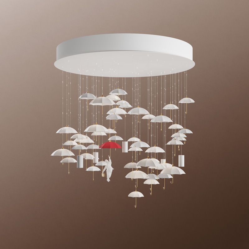 Люстра René – уникальный продукт совместного творчества итальянской школы дизайна и команды Sagarti, который создает новую реальность в дизайне интерьера. Коллекция "Rene" включает люстры и подвесные светильники, вдохновленные произведениями Рене Магритта. Центральный элемент — фарфоровый зонтик с оптоволокном, создающий эффект парящего света. Фигурка летящего человека добавляет сюжет и символизм, а разнообразие размеров позволяет использовать коллекцию в гостиных, холлах и лестничных пролетах.