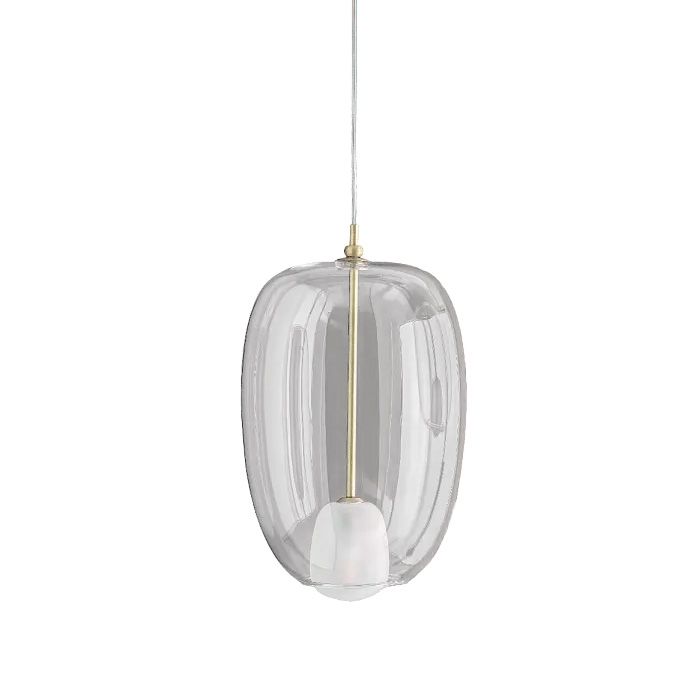 Внутренний овальный плафон выполнен из матового стекла и скрывает LED-лампочку мощностью 5 Вт. Источник света находится в бесцветной стеклянной сфере, форма которой может быть вытянутой овальной или закруглённой в зависимости от модификации светильника. Также доступна версия с плафонами из тёмного тонированного стекла. Серия Blow состоит из додвесного светильника с боросиликатным стеклом, натуральной латунной рамой и розеткой, а также потолочным светильником, который можно комбинировать с многосекционной потолочной розеткой 56.35RS.