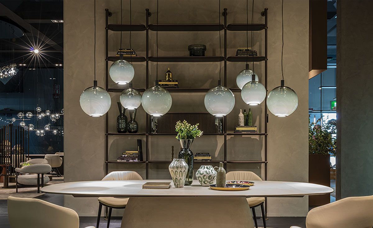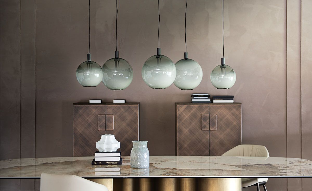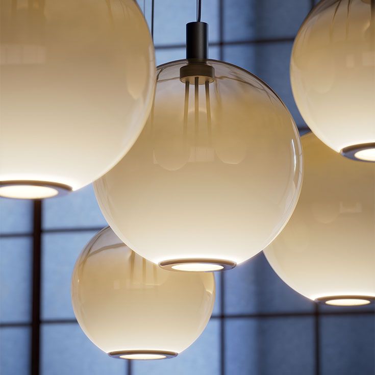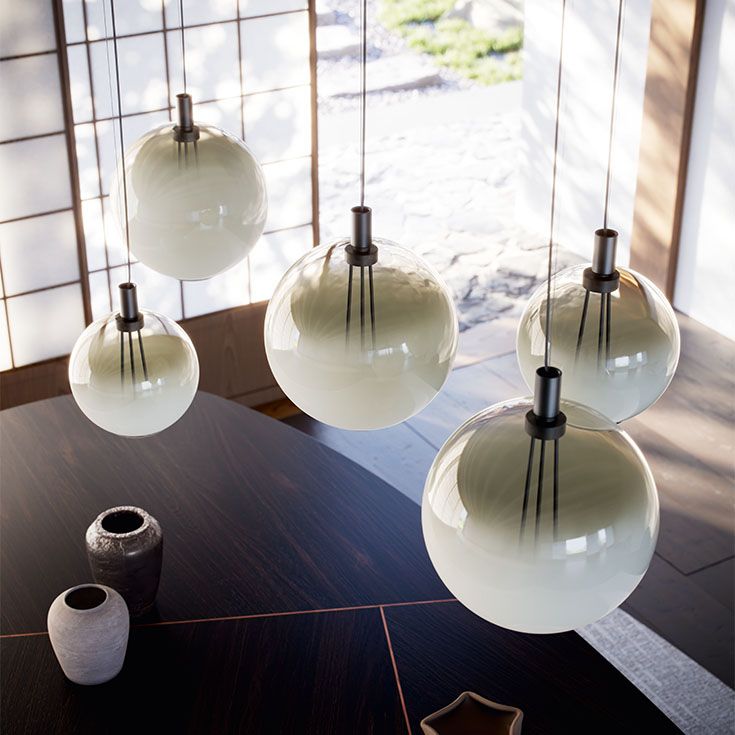 Эти современные светильники предоставляют бесконечные возможности для конфигурирования, позволяя создавать уникальные композиции, отражающие ваш личный вкус. Каждый абажур можно подвесить к потолку отдельно или установить на круглое основание, на котором размещается от двух до шести светильников, расположенных на разной высоте и расстоянии друг от друга, и разных размеров. Современная стеклянная люстра