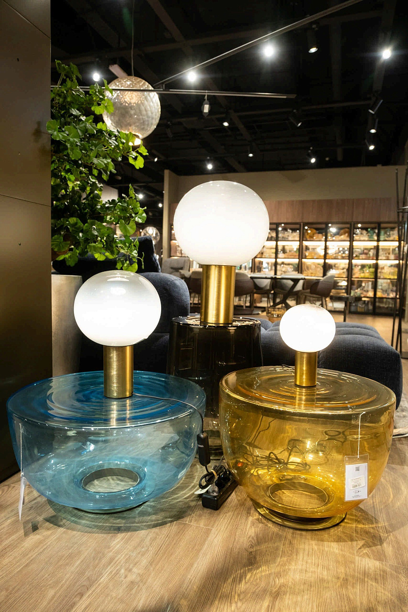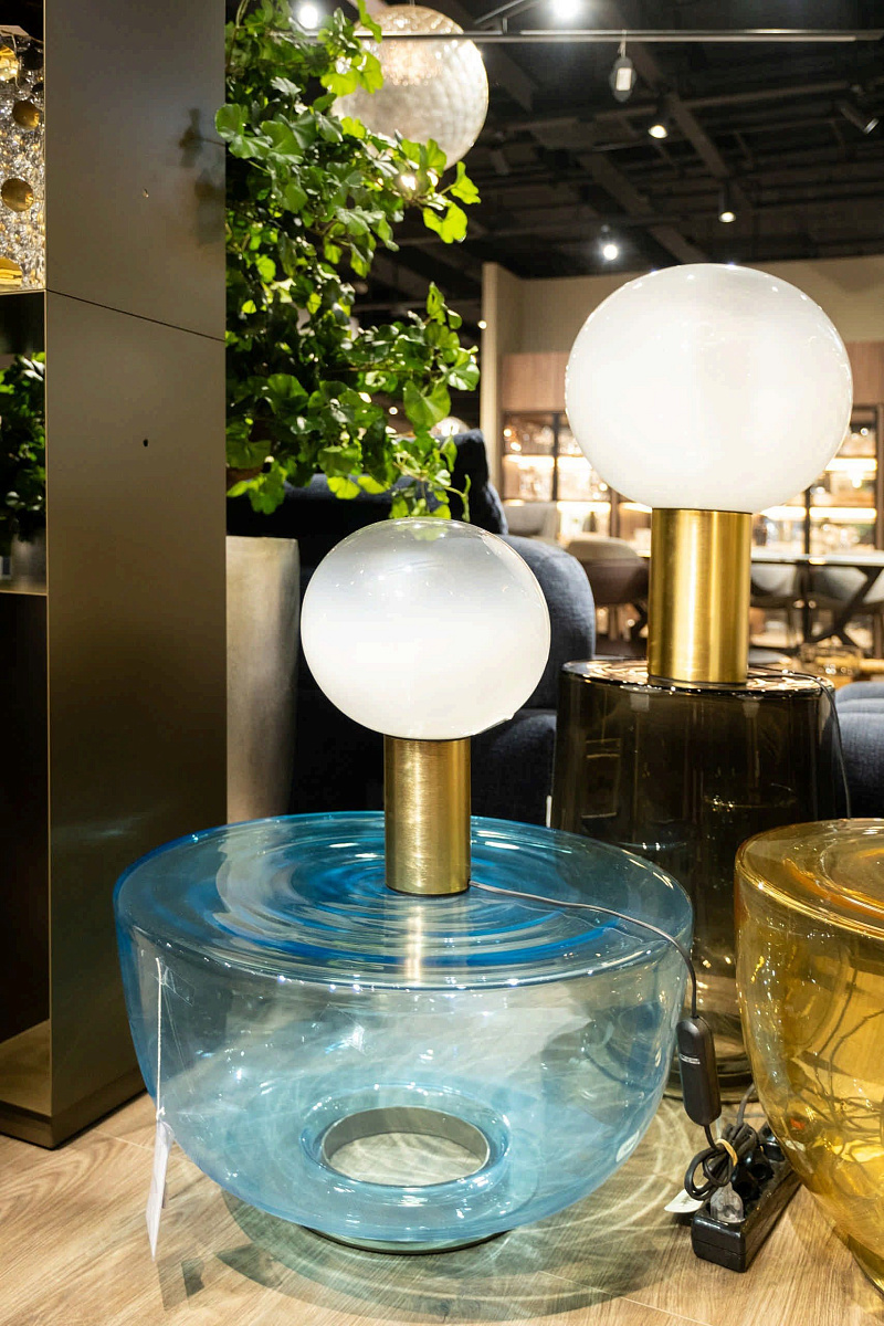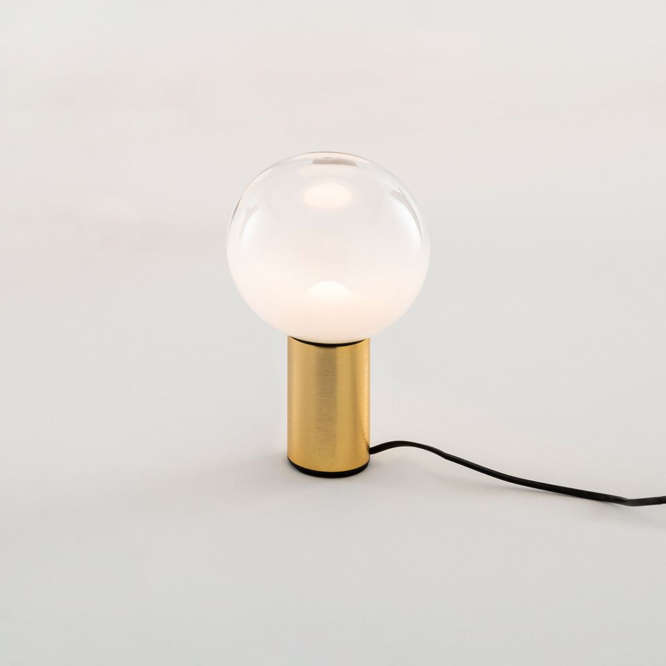 Настольная лампа Artemide Laguna Table с круглым рассеивателем из дутого стекла и цилиндрическим металлическим основанием. Рассеянный свет. Для лампочек E14/E27. С выключателем (⌀ 16 см) или диммером (⌀ 26/37 см) на кабеле.