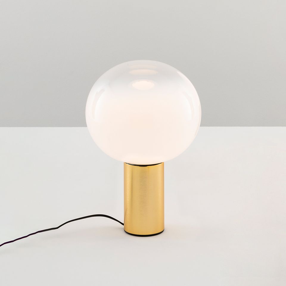 Настольная лампа Artemide Laguna Table с круглым рассеивателем из дутого стекла и цилиндрическим металлическим основанием. Рассеянный свет. Для лампочек E14/E27. С выключателем (⌀ 16 см) или диммером (⌀ 26/37 см) на кабеле.