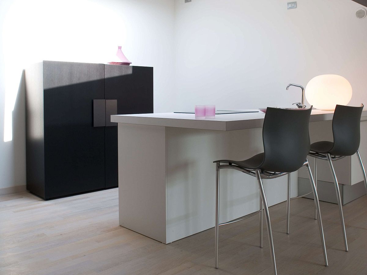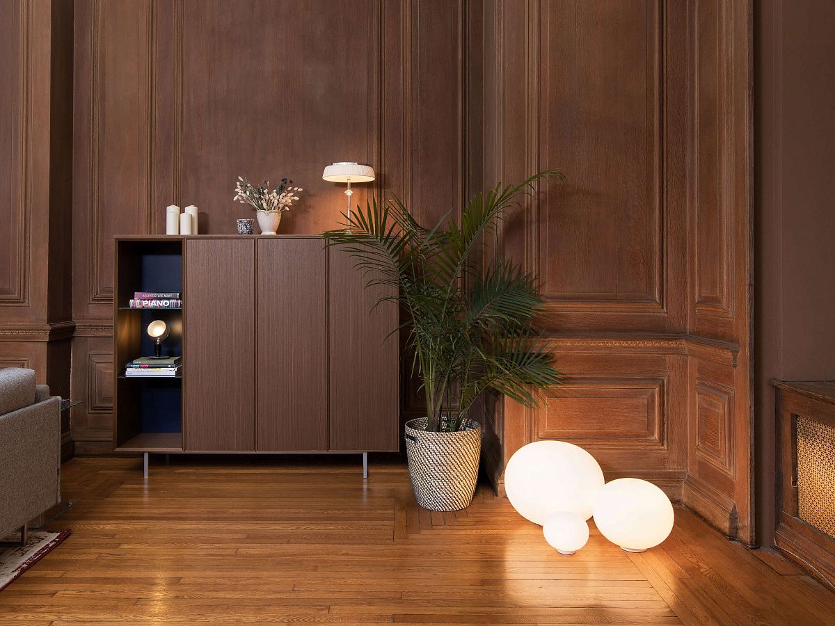 Настольная лампа, обеспечивающая рассеянный свет. Рассеиватель состоит из матового опалового стекла, протравленного вручную, выдувного вручную, и кольцевой гайки из литого под давлением алюминия с резьбой и алодиновым покрытием. Основа из литого под давлением полиамида, армированного стекловолокном на 30%. Опора диффузора из литого под давлением алюминия, окрашенного в серый цвет. На кабеле имеется электронный диммер, позволяющий регулировать яркость света.