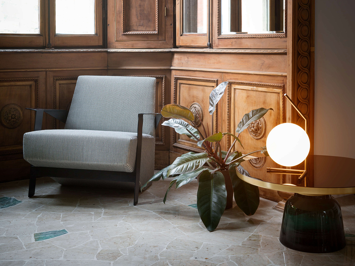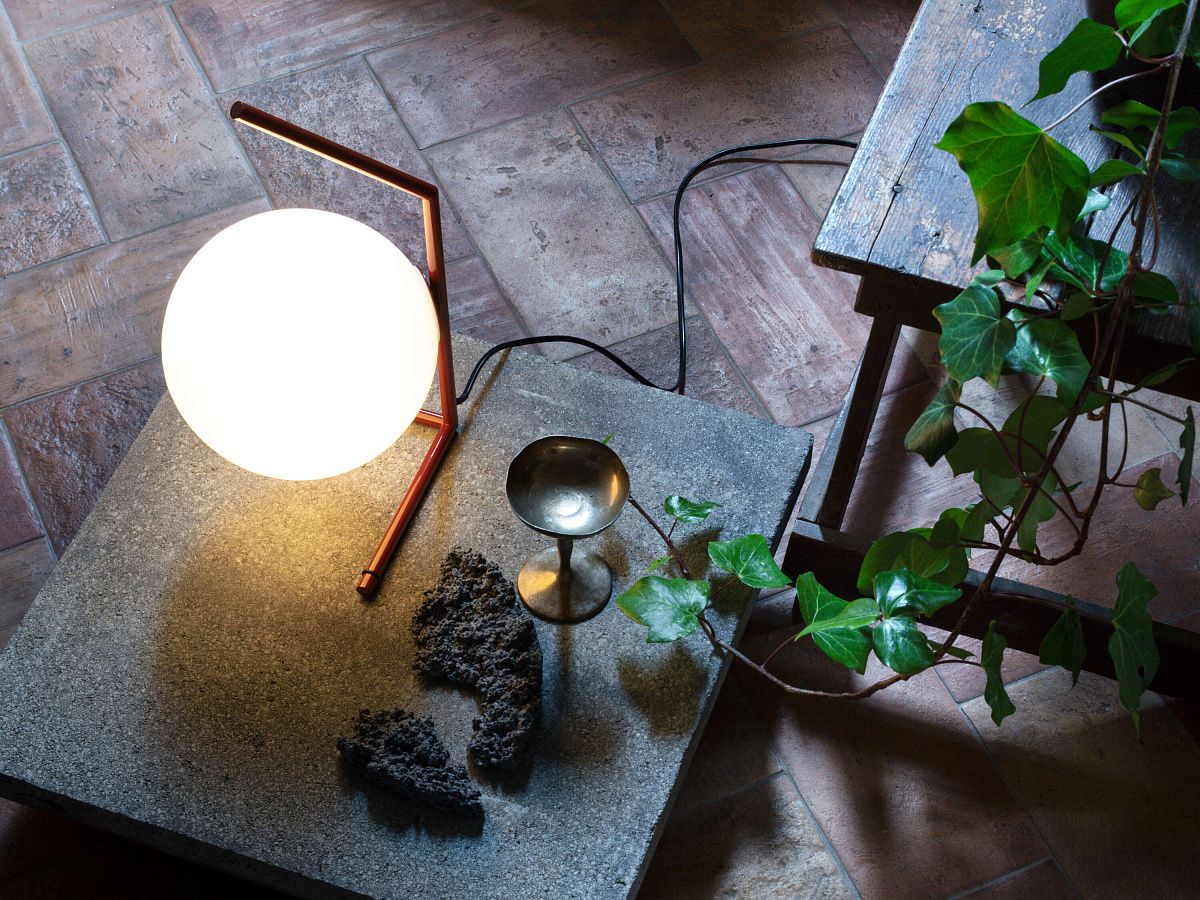 Настольная лампа, дающая рассеянный свет. Каркас из латуни, черной или хромированной стали. Рассеиватель из дутого опалового стекла. Диммер на аккорде питания.