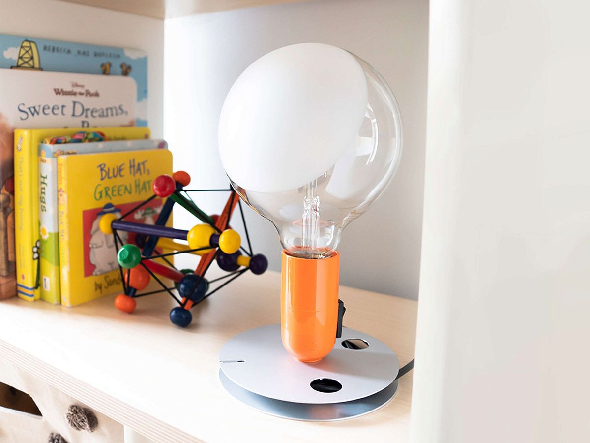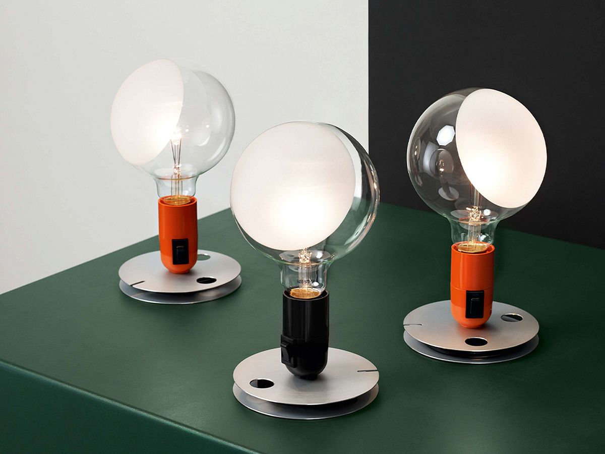 Настольная лампа, дающая прямой рассеянный свет. Основание из анодированного алюминия служит для удержания лишнего шнура питания. Бакелитовый патрон лампы, окрашенный в цвет выключателя в оранжевый и черный цвета. Прозрачный шаровой светильник частично подвергнут пескоструйной обработке для рассеивания света.