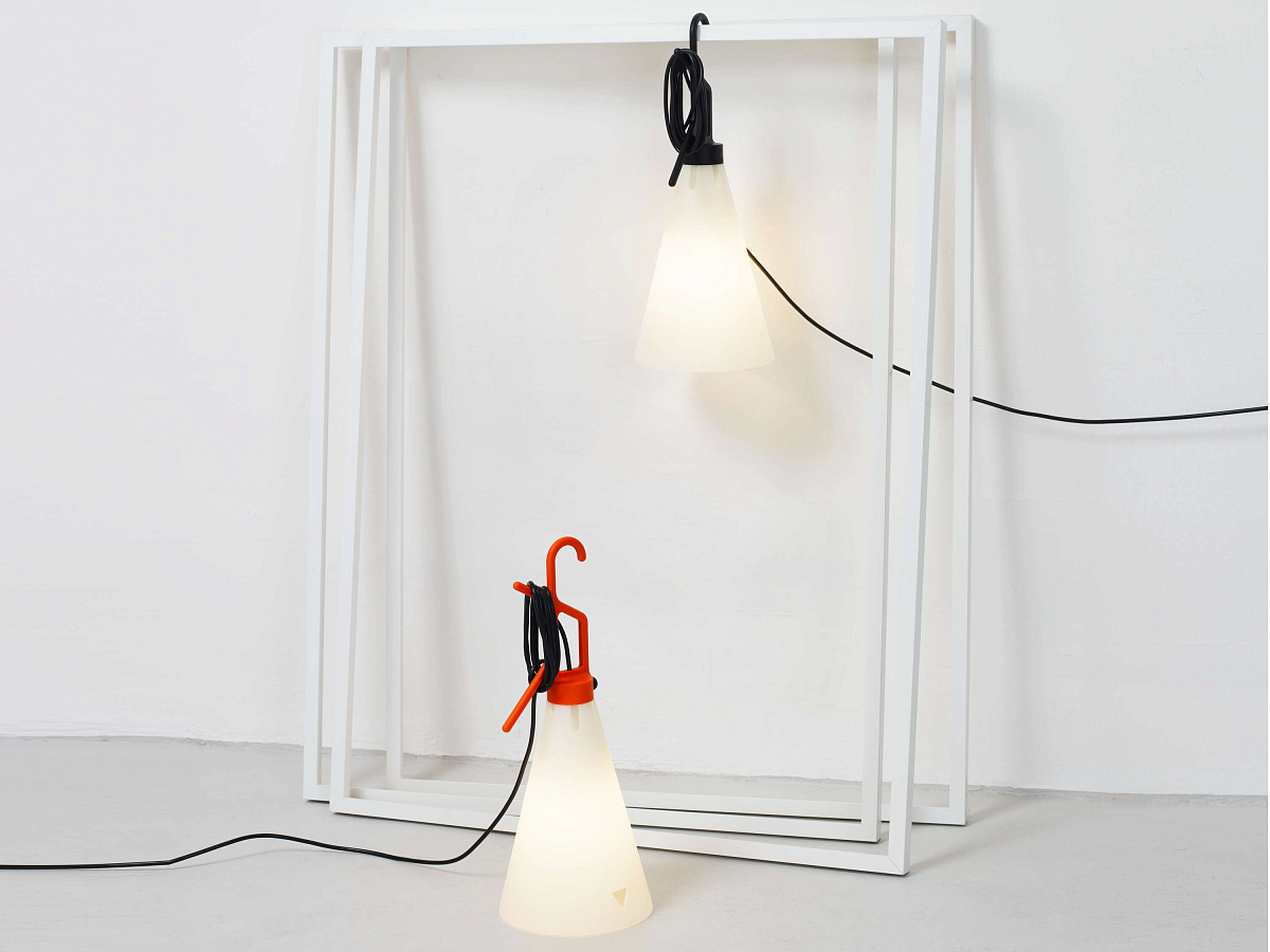 Многофункциональный осветительный прибор. Крючок/ручка, которая также работает как устройство для намотки кабеля, и литой опаловый конический диффузор, изготовленный из экологически чистого полипропилена, полученного из отходов промышленных процессов. Кнопочный переключатель расположен на ручке. Поскольку в процессе сборки не используется клей, Mayday легко разбирается, поэтому каждую деталь можно отправить на переработку.