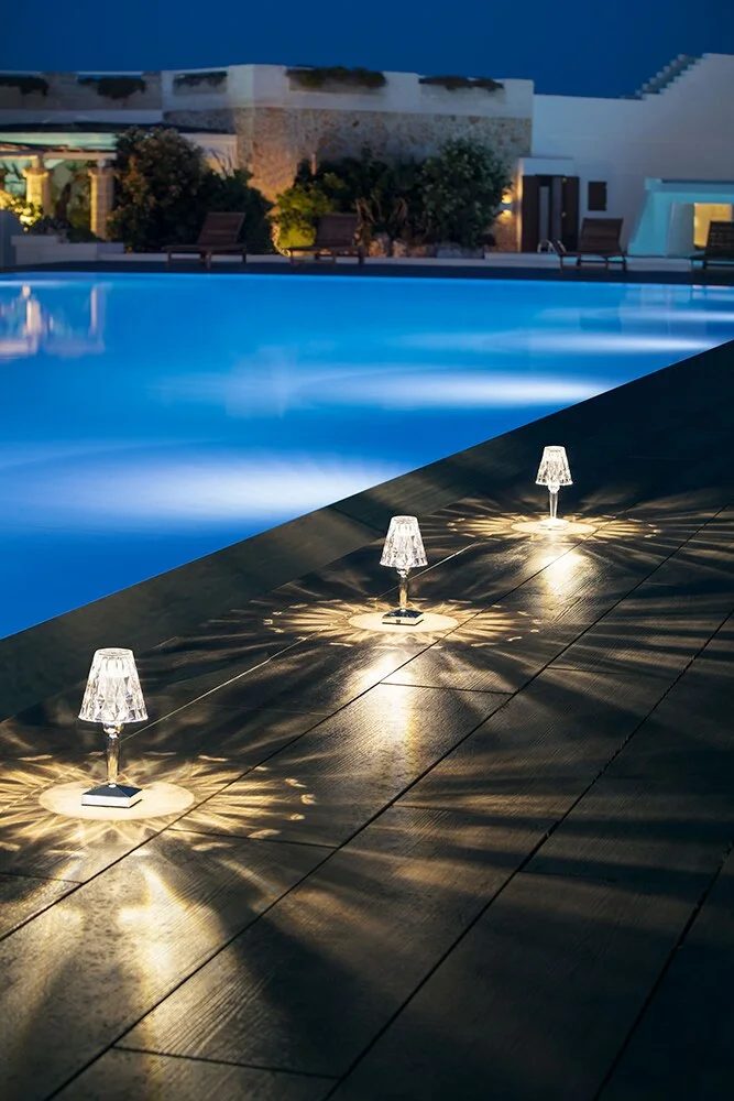 Battery представляет собой компактную настольную лампу, отличающуюся инновационной особенностью: она на 100% перезаряжается благодаря простой электрической вилке и обеспечивает до восьми часов автономной работы. Благодаря этому его легко перемещать, он идеально подходит для временных контрактных установок, использования в кафе или ресторанах под открытым небом.