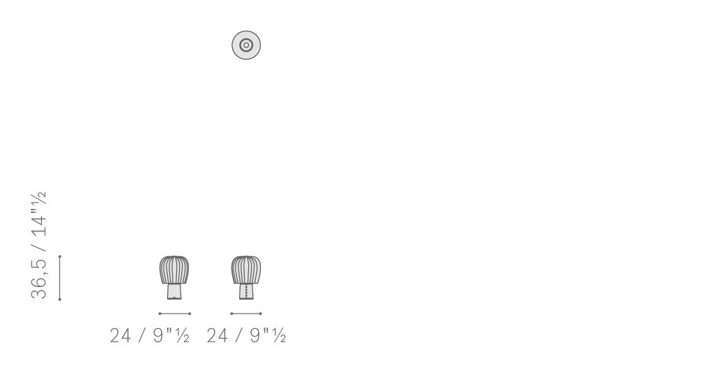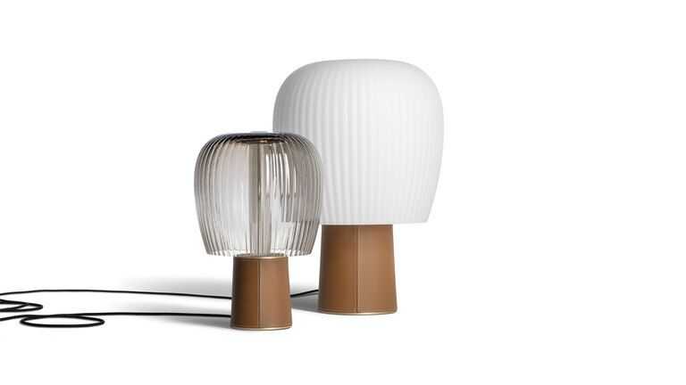 Настольная лампа Nymph изготовлена из выдувного стекла с рифлёной поверхностью и доступна в различных вариантах отделки. Лампа имеет цилиндрическую форму с LED модулем в основании. Основание обтянуто тканью Pelle Frau® ColorSphere различных цветов с контрастной строчкой и латунными металлическими деталями. Управление яркостью осуществляется сенсорной системой диммера.