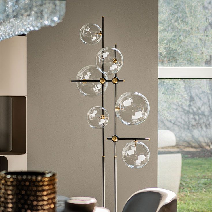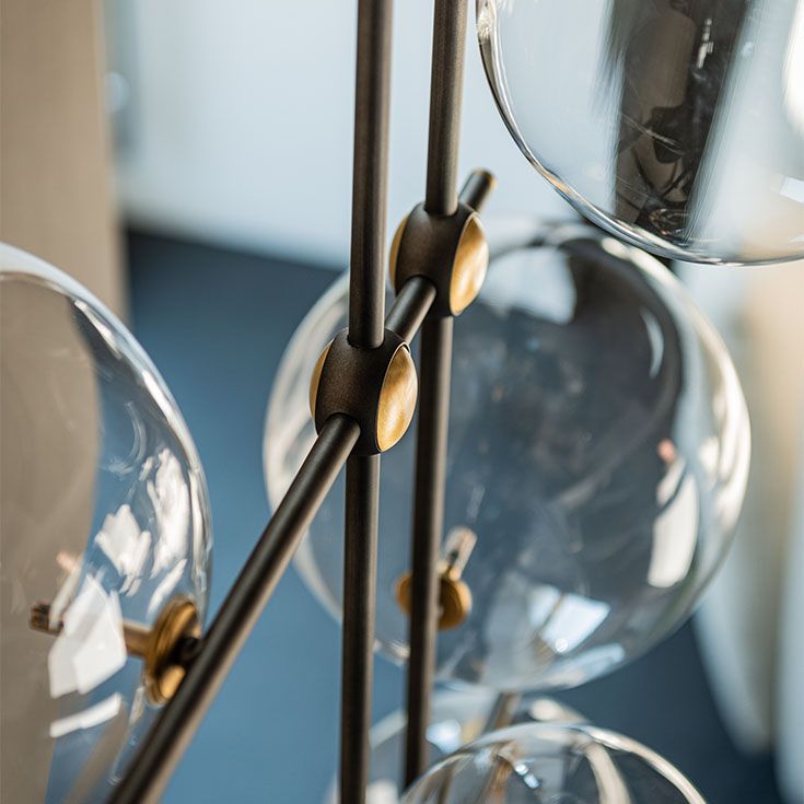 Bloom — современная люстра , состоящая из тонких металлических ветвей, которые «распускаются» шестью большими прозрачными хрустальными сферами, сияющими, словно спелые фрукты на солнце. Соединения и концы ветвей, важные технические детали, украшены отделкой из матовой латуни, что делает их декоративными элементами. Соединительные элементы доступны в разных размерах, чтобы сбалансировать композицию веса и объёма. Отличительная особенность этого подвесного светильника заключается в его изменчивой природе: можно комбинировать несколько люстр, создавая повторяющийся модульный эффект. Bloom также может быть интерпретирован в виде торшера с тонким и элегантным стеблем, который разветвляется в пространстве, создавая трёхмерный эффект. Где свет, там жизнь: даже торшер превращается в изображение растущего растения, а абажуры напоминают листву.