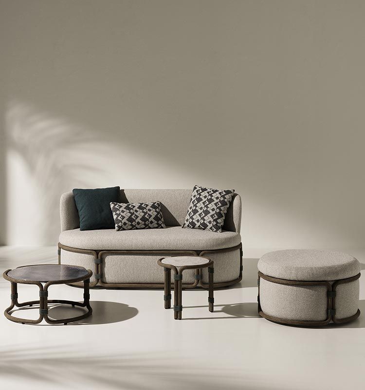 Rotin — это коллекция мебели для гостиной, в которой форма, цвет и содержание сливаются воедино, рассказывая историю о новом подходе к созданию мест для отдыха в компании на свежем воздухе. Коллекция Rotin, включающая диван, кресло, журнальный столик и пуф с каркасом из протравленного тика, вдохновлена азиатскими традициями, где бамбук является основным элементом садовой мебели, а также технологиями, традиционно используемыми при производстве ротанговой мебели. Помимо формы и содержания, Rotin – это ещё и цвет, и декоративная ценность этой коллекции подчёркивается тканями насыщенных оттенков и поверхностями ярких оттенков. Столешницы журнальных столиков отличаются особенно креативным использованием цвета, уникальными узорами и исключительной ручной работой. Они, по сути, изготовлены полностью вручную из эмалированного лавового камня, мраморной крошки или цемента, создавая прекрасные композиции, вдохновлённые палладианской техникой. Оригинальное сочетание этих «деталей» в камне обусловлено использованием трёх видов мрамора: зелёной гватемалы, чиполлино и бардильо, между которыми проложена цементная затирка, создающая элегантные геометрические узоры на поверхности. Идеальный баланс комфорта и дизайна: Rotin — это свежая, энергичная коллекция, новое представление о форме, функциональности и эргономике для улицы. Rotin — идеальное место для отдыха и развлечений, которое дарит приятные моменты благополучия, создавая уютные и гостеприимные жилые пространства. Эта коллекция также будет великолепно смотреться в интерьере.