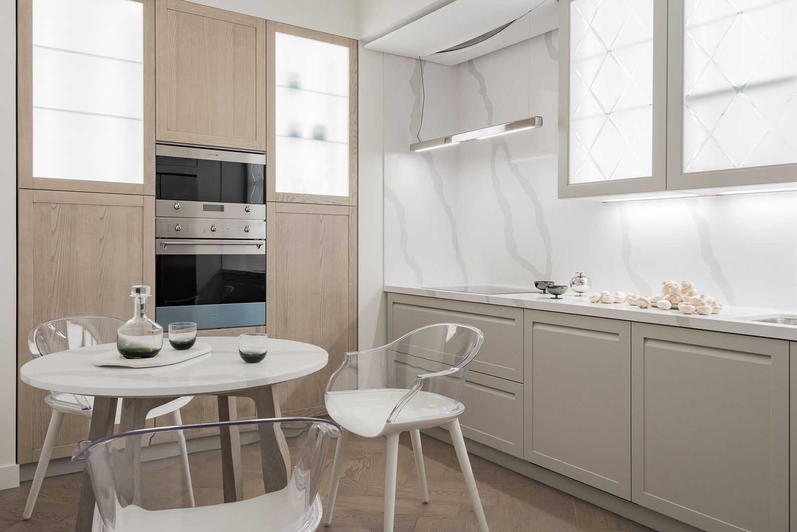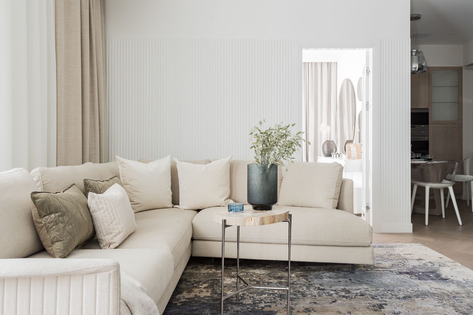 Светлый, лаконичный, небанальный интерьер для семейной пары, гармонично вписывает тщательно продуманные и утонченные детали. Ковры, аксессуары, картины, вазы, посуда и даже люстра над обеденной зоной — все эти предметы изготавливались вручную и наполнили пространство жизнью и уютом.